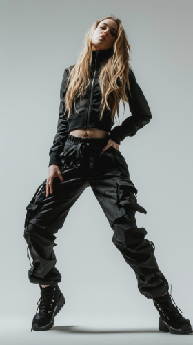 A beautiful thai full body female character with a wolf haircut, black hair, black long sleeve shirt, camo jogger pants with knee pads, military shoes, wearing a green backpack, a black and gold belt, weapon holdsters around thighs, holding pistols. She is staring off to the side holding her pistols down by her side --ar 8:11