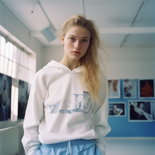 young fashionable woman wearing blue and white colors sweatpants and sweatshirt in dance studio, activewear fashion crafted for living, photographed by juergen teller in 35mm