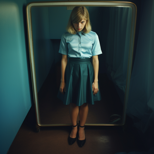 An anime-style young girl sitting in front of a vending machine. She has light blonde hair, blue eyes, and is wearing casual clothing, including a T-shirt, shorts, and an oversized jacket. The overall color scheme is vibrant blue, with a background featuring a vending machine and plants. The scene has a futuristic yet relaxed atmosphere, with detailed and intricate artwork. Emphasis is placed on the reflection of light and shadow, creating a clean and refreshing visual impression. --ar 3:4 --style raw --stylize 800