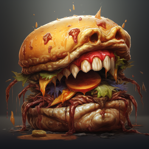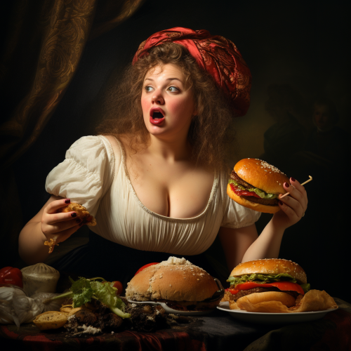 girl rich fat eat hamburger, style Caravaggio, crazy, frightening, high resolution, real scene, 8k