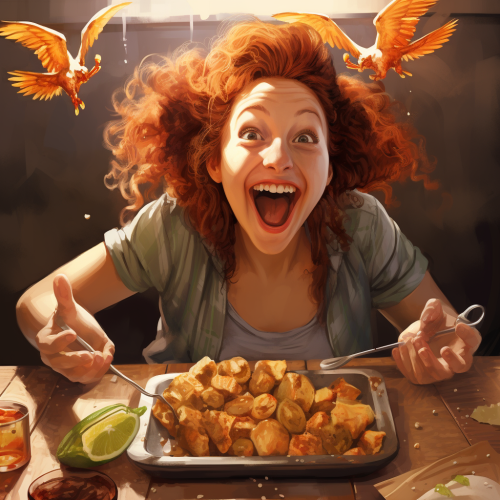 "Illustrate photo of delight on this chick's face as it enjoys some delicious chicken wings and nuggets."