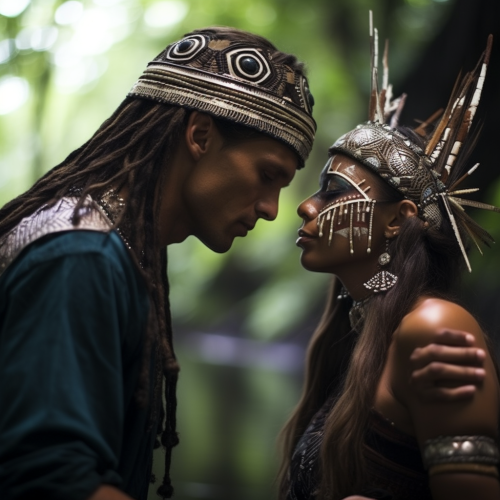 the most beautiful man from a tribe in the Amazon forest coming out of a river in Alter do Chão meets the most beautiful woman from Salvador, which is going in the water, as they gaze at each other for the first time, with the feeling of having met in previous lives.