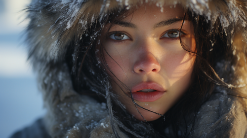 Cinematic, Eskimo from Inuit tribe, Iglu, Kodak Gold, detailed_facial_features, tribe background, winter scene, snowpunk --s 250 --ar 16:9