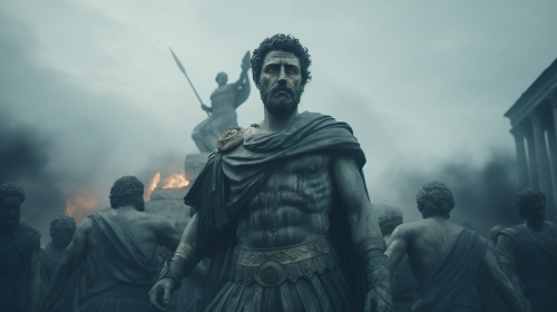 The portrait of the statue of Marcus Aurelius looked angry. Portrait of the whole body. Background of old buildings or historical objects or fire or clouds or something extraordinary and inspiring but blurred, 8k --ar 16:9
