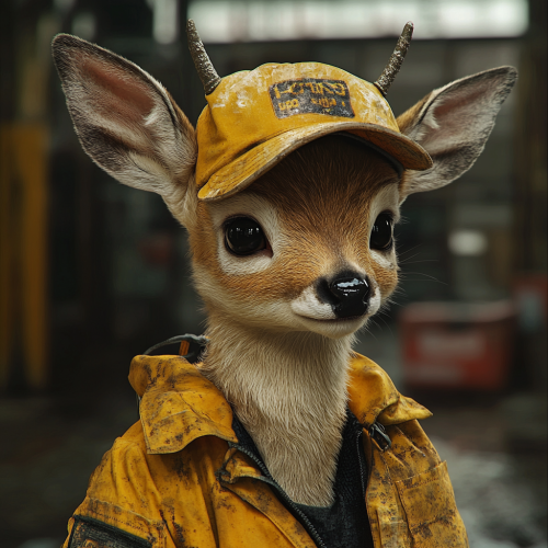 sad, tired cute anthropomorphic baby deer fawn wearing workers uniform, he is a convenience store warehouse worker, he is very tired, exhausted, broken, weary and sad. photorealistic