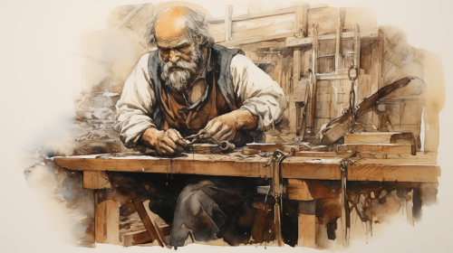 highly stylized pen and ink drawing with watercolor wash medieval shopkeeper in his store selling general supplies --ar 16:9