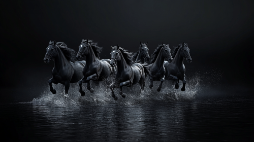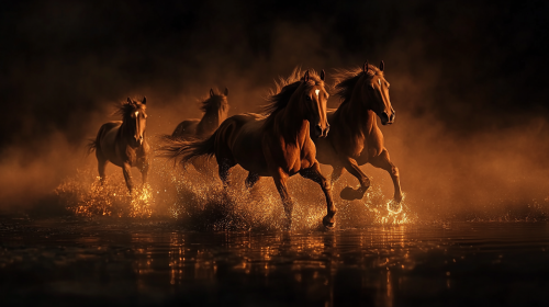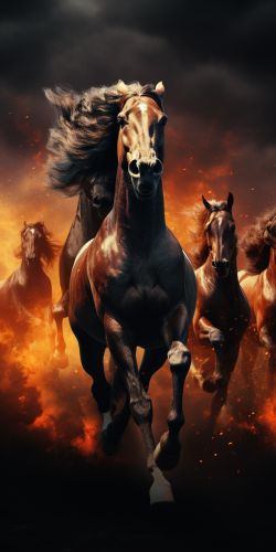 hi contrast cinematic photograph of flaming horses galloping. In a dark realism style. Hd 8k ultra detailed. --ar 10:20