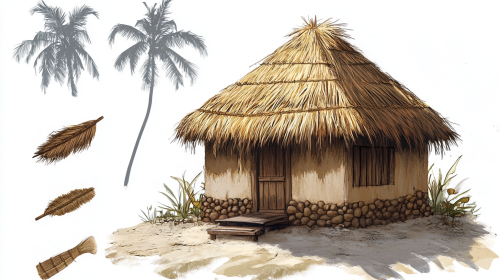 design an island hut meant for servants of a nearby resort to sleep in, small and simple architecture. Walls made of mud and sandstone, with thatch roofing. clear indication of shape and silhouette in orthographic style, full color and realistic. --ar 16:9
