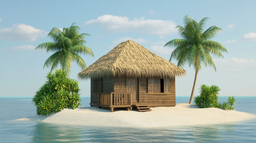 design an island hut meant for servants of a nearby resort to sleep in, small and simple architecture with sand-based walls and thatch roofing. clear indication of shape and silhouette in orthographic style. --ar 16:9