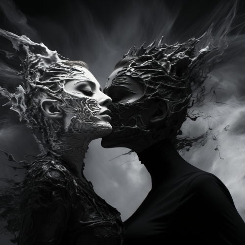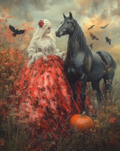 create a mysterious, haunting and yet spooky Halloween night, with grinning pumpkins and cawing crows, suddenly in the dark and spooky woods two horses appear , one black and one white, in Renaissance style, are galloping freely and lively , captured in dramatic, painterly light with meticulous detail into a haunting elegance, beautiful Nordic nature in warm autumn colors, a full body portrait inspired by Man Ray's visionary photography, the reflection is amazing beautiful, --ar 4:5 --s 500 --p teqj53c
