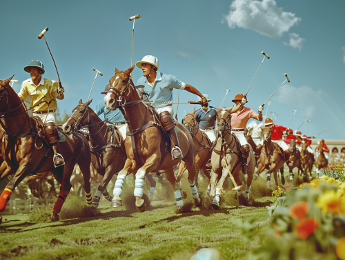 Create a dynamic and action-packed advertisement style photograph capturing a men's polo game in full swing. Show a team of athletic, well-dressed players in traditional polo attire, different colored collared shirts, helmets, riding powerful, well-groomed horses at high speed on a lush green polo field. Highlight the intensity of the game as players swing their mallets. Surround the scene with an elegant atmosphere, with a clear blue sky, well-dressed spectators in the background. The ad should be vibrant, capturing energy, tradition, and elegance in vivid colors and fine detail, octane rendering, extreme reality, panoramic view, shot on Arri, Wes Anderson style photography, shot from a distance --ar 4:3 --v 6.0
