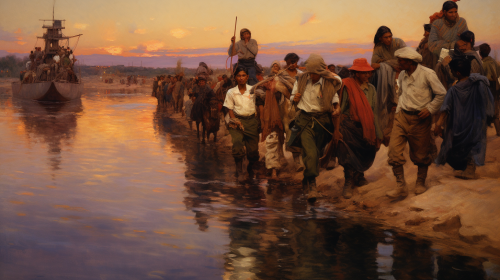 federal troops escorting immigrants across the Rio grande to Mexico, style of Norman Rockwell, --ar 16:9