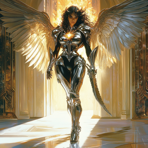 medieval illustration, etching, female fallen seraph wearing heavy armor, halo of fire, large red wings, pale skin, starry night sky, black gold and red --ar 16:9