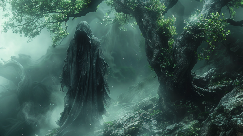 wide shot, eerie corrupted male Archfey Patron, evil shadow deity, cursed dark feyrealm, dnd grim dark art, corrupted fey and nature, DnD atmosphere, 8k digital, super resolution, --v 6.0 --s 750 --ar 16:9