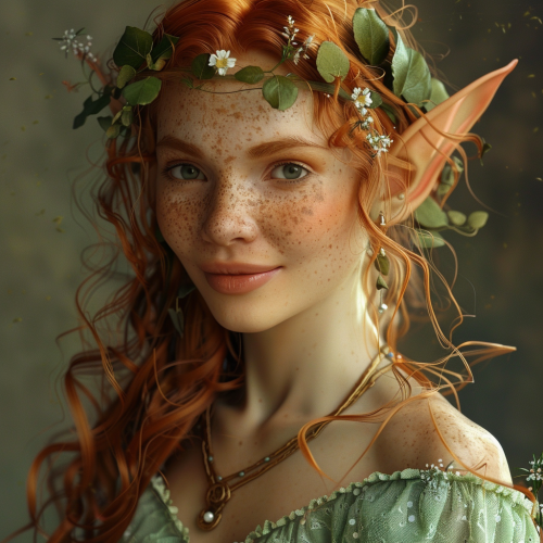 female archfey, look like elf with light red hair and lot of freckles, she is wearing light green spring dress, she is constantly smiling and joyful, extremely but disturbingly beautiful