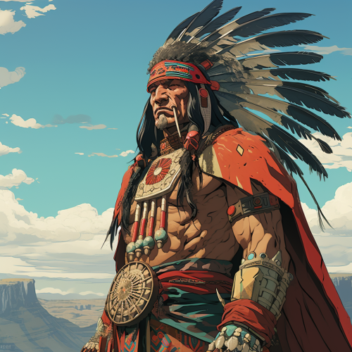 spirit of an aztec elder wearing a flowing runed poncho, high quality anime screencap, 8k resolution, sciencefiction fantasy battlesuit, bleach-like, 90s anime, VHS anime, comic art, high class, unapologetic grit, ornate staff in left hand, centralized, insane detail, zoomed out, centralized --ar 1:1 --v 5.2