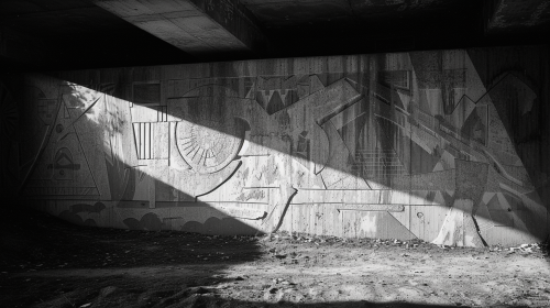 conrcrete wall with ancient abstract engravings that depict a nuclear war betweem people and destruction of civilization, sunlight, high contrast, black and white, ilford hp5, film photo, grain, shot on film camera, futuristic, geometrical, bladerunner, concrete, wallace office bladerunner, barrozi veiga --v 6.0
