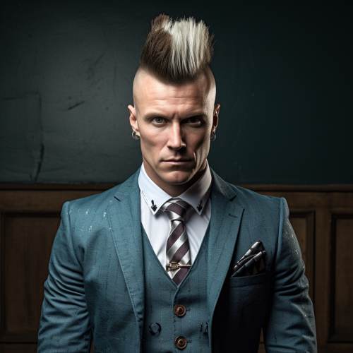imagem realista de um homem ruivo com topete na frente e raspado dos lados. Tem olhos castanhos nariz com ponta arredondada e laterais redondas, queixo e maxilar quadrados, lábios finos, com o semblante sério e tatuagem na lateral da cabeça