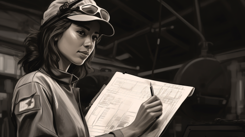 super close-up of a female mechanic holding a piece of metal, checking for mistakes, movie storyboard sketched in pencil, black and white --ar 16:9