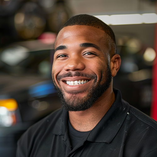 a mechanic wearing a black short sleeve polo, smiling, professional, getting picture taken, portrait, canon dslr