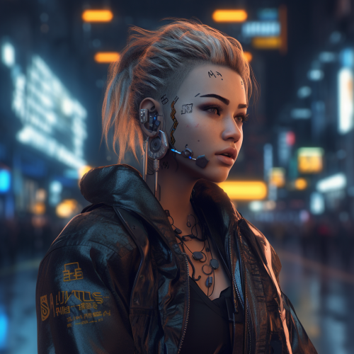 a full body shot of a beautiful female cyberpunk character. She wears tight cyberpunk street wear. In the background is a cyberpunk city at night. Detailed digital painting --ar 2:3 --v 6.1