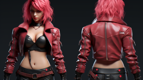 cyberpunk style female with pink hair, wearing a red leather jacket with a black crop top underneath, different angles, character sheet, photo realistic --ar 16:9
