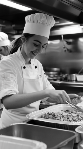 a wide full body shot of a young female student chef wearing a hairnet, plating a meal into a takeaway container a commercial kitchen, they are smiling, StoryBoard Style, Black and White, Skitch --ar 9:16