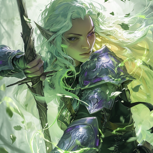 female elf, light green skin, shiny silver eyes, hair yellow and green, purple marks at face and body, wearing a light armor. The character should convey a sense of adventure and determination, perfect for an RPG game avatar. She is fighting with a adorned lance and shiny nature powers, game anime style. --v 6.0