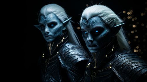 two stern astral elf guards looking at camera, very low camera angle, a low angle shot, from below, underglow, low light, empty black background --ar 16:9