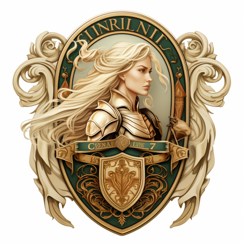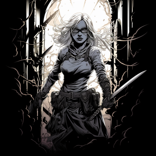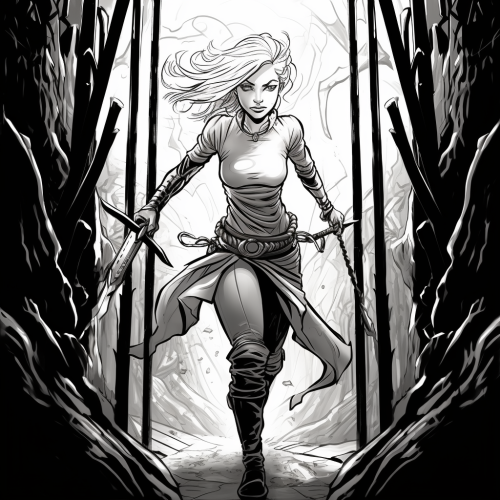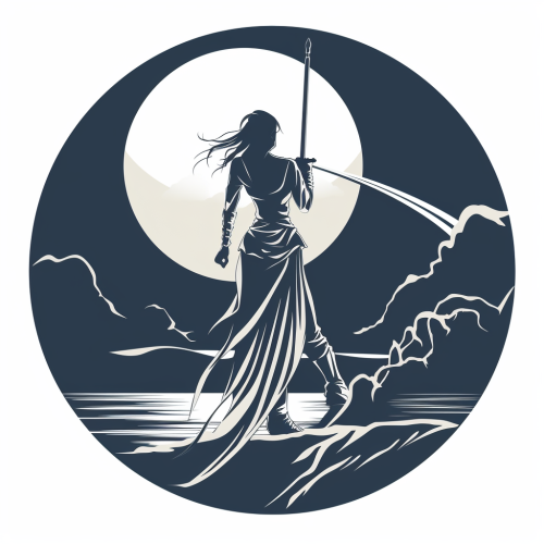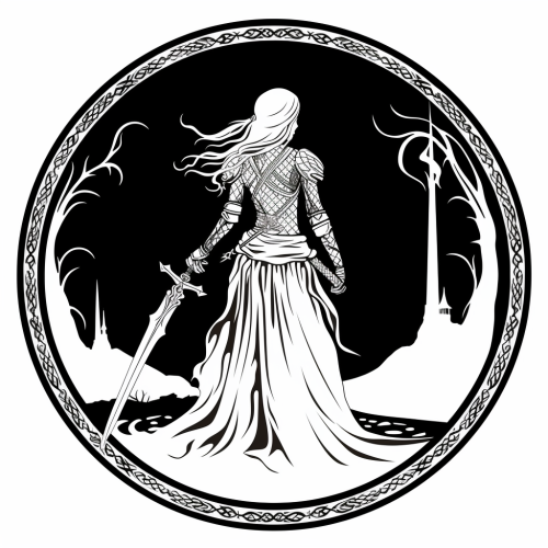 a circular logo with elvish border containing a female elven warrior holding a broadsword out to her side walking through doorway. Rear view. Single color in white with black background.