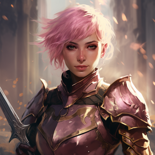 Generate an image of a female elven fighter character wearing half plate armor and wielding a longsword. The character should have a pixie cut with light pink hair, and be adorned with a burgundy cloak adorned with golden designs