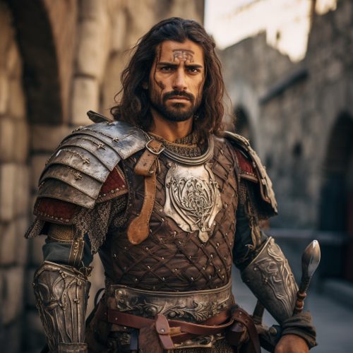iron age lydian warrior from kastamonu standing in an iron age aegean town wearing lydian armor and holding a sword