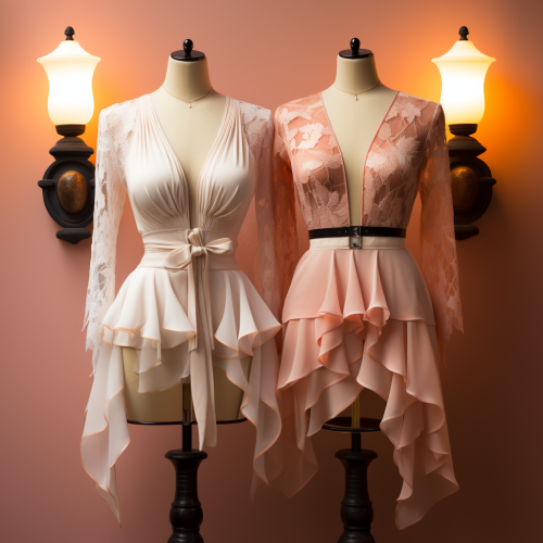 :exclusive high end couture fashion models on runway fantasy mini dress fairy gown short mini skirt peplum organza sheer lace in white and pink, 8k render ultra realistic photography La Perla Neoprene Chantal Thomass lingeri, sharp focus, cinematic lighting --s 750 --style raw