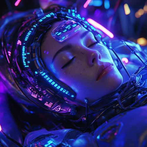 female cyborg connected with sci fi cabled on her head, sleeping pod, front view, blue and purple neon lighting, futuristic sleeping pod, metal reflections, lots of small digital screens that show vitals, flying huds, octane render, high RTX reflections, 4k details