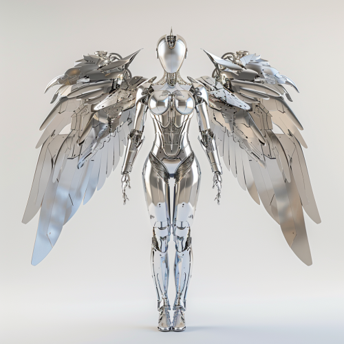 a fullbody posing female cyborg with metalic angel wings, chrome Tokusatsu, sensual, minimalist, sci-fy, mechanoïd, futuristic, refined