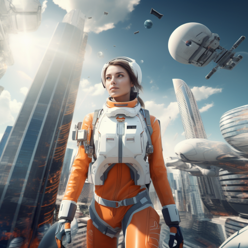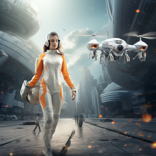 drone shot Female Doctor Astronaut in urban warzone with a futuristic minimal space suite orange and white color or material ... photography .... side drone shot .. misty atmosphere ... bright image, ultra in the style of realistic hyper-detailed rendering, vray tracing, futuristic, oshare kei, meticulous design, innovative page design ...