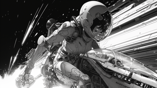 Sci-fi manga illustration by Tsutomu Nihei and Masamune Shirow, female pilot in exosuit, jetpack, futuristic airstrip, dramatic lighting, eye level angle, smooth and detailed lines --ar 16:9 --v 6.0