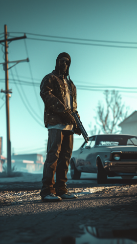 A gang member inspired by GTA 5 roleplay, it should be baltic Lithuanian, holding a pistol, near a cool car, photorealistic --v 6.0 --style raw --ar 9:16