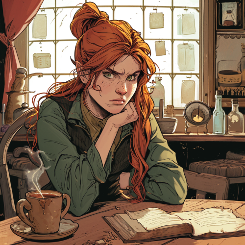 vertigo comic style annoyed red-haired female halfling wizard siting in a 1990s coffee house with spellbook --v 6.0