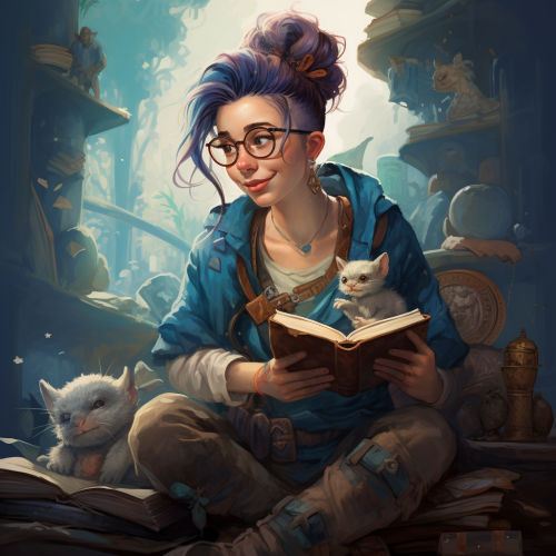 halfling, librarian, adventurer, female, blue hair in a bun, glasses, with a ferret, fantasy