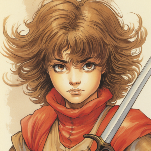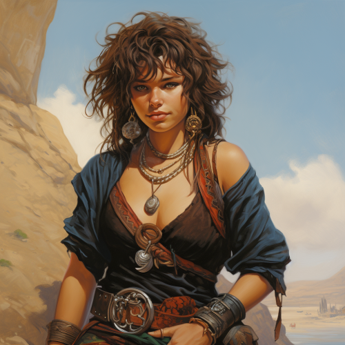 female hippy halfing, short curly brown hair, D&D character, style of clyde caldwell