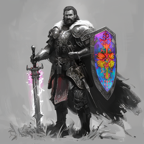 photorealistic, medieval style, facing viewer, black and white, male halfling paladin with a colorful princess shield and glowing sword