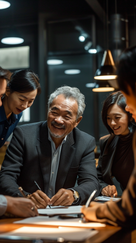 Create a professional scene inside a modern office in Thailand. The image should feature a notary public at their desk, attentively reviewing and signing official documents. The office should have subtle Thai elements, like traditional decorations or cultural symbols, to reflect the location. Include clients sitting across from the notary, engaged in the process. The overall atmosphere should convey trust, professionalism, and the importance of notary public services --ar 3:2 --v 6.1