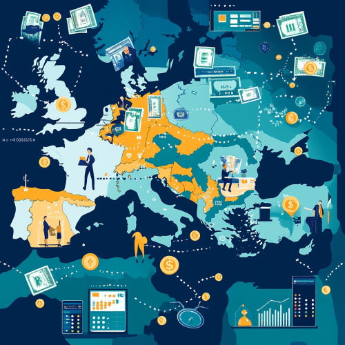 An illustration depicting Serbia as part of the Single Euro Payments Area (SEPA) in a 16:9 aspect ratio. The center of the illustration should feature a map of Europe with Serbia clearly marked, surrounded by symbols of money such as banknotes and coins. Include icons representing banking services, such as ATMs and online banking. Add a chart showing the reduction in transaction costs or the acceleration of payment processing times. Showcase people using banking services, such as using mobile apps or visiting a bank, to emphasize the human aspect of the change. Use bright colors, such as blue and green, to create a sense of financial stability and progress. The style of the illustration should be modern and visually appealing.