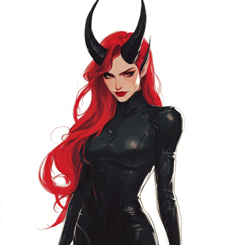 full body smirking red skin female super villain with horns. black leather costume. white background. style of charlie bowater, laurie greasley and james jean, charlie bowater art style, beautiful comic art