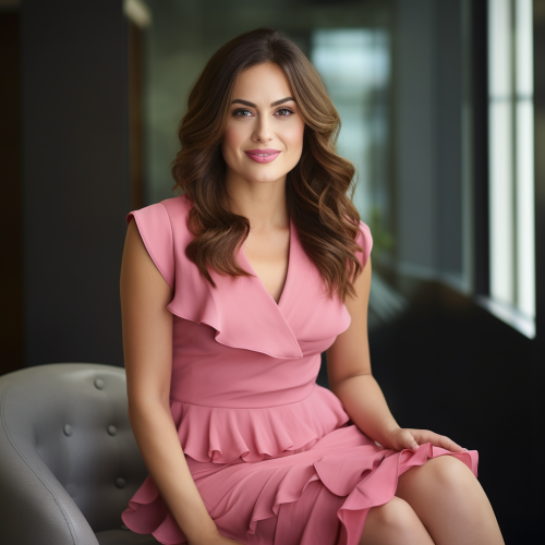 a female with flowing brunette hair, in a stylish pink peplum dress. in a corporate setting