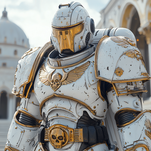 create a full body male space marine in full battle armor in the color gold and white while in combat from the world of warhammer 40,000. 4k, 8k, photo realistic, unreal engine 5, 1080p --s 750 --q 2