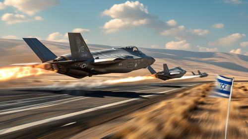 f35 fighter jets takes off at high speed from the runway, missiles, israeli flags on the side of the runway, blue sky, desert in the background, Disney Hybrid Style, Disney 3D Cartoon, Hyper-Detailed , soft color blending, --ar 16:9 --v 6.0