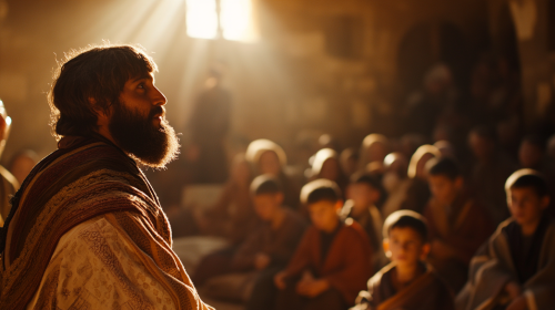 Paul the Appostile speaking to the children of Israel during Rosh Hashanna wearing prayer shawl, 50AD, cinematic, dynamic, lens flare --ar 16:9 --v 6.1