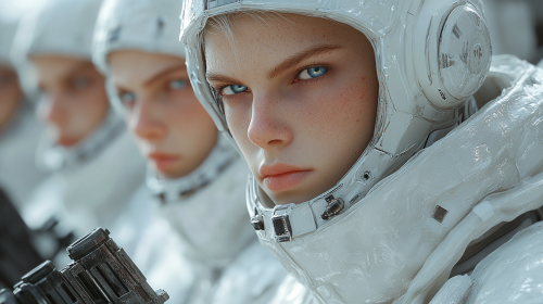 full body, potrait; Highly artificial human face, 4 cyborgs 2 m tall, humanoid, bodybuilder wrestler physiques, face with sharp nose, emotionless looks ash blond hair cut short, dark blue eyes, pronounced jaws, dressed in white military uniform, holding machine gun; setting a military space base.; Annie Leibovitz , high contrast tonal, hq photography sets colours, arches, vogue velvet, iridescent, holographic, full body pose, transparent details, colourful, photorealistic, highly detailed, transparent parts, looks like professional hdr photography in a fashion magazine, editorial photography, global illumination mood lighting, post-processing, glowing shadows, chromatic aberration, black and white balance, dispersion, beautiful cinematic lighting, lumen reflections, post-production, high-fashion, tone mapping, shaders, 3d diffraction grading, octantian rendering, detailed, hyper-realistic, 16K, --ar 16:9 --stylize 750 --v 6.1